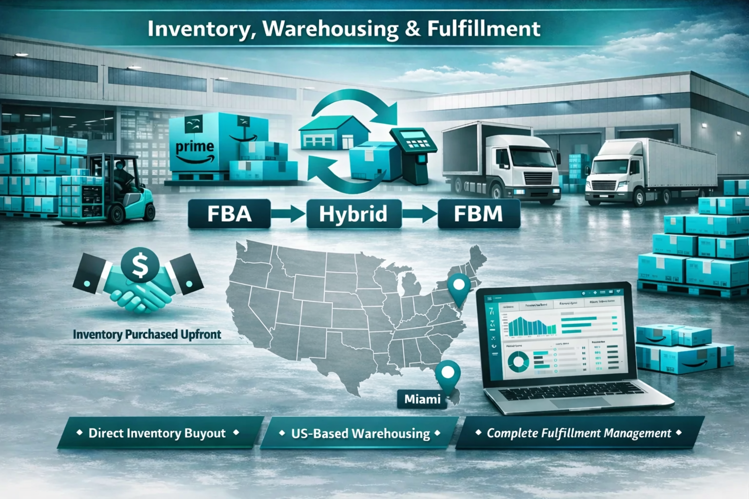 We purchase your inventory directly and manage Amazon FBA, FBM, and hybrid fulfillment using our US warehouses.
